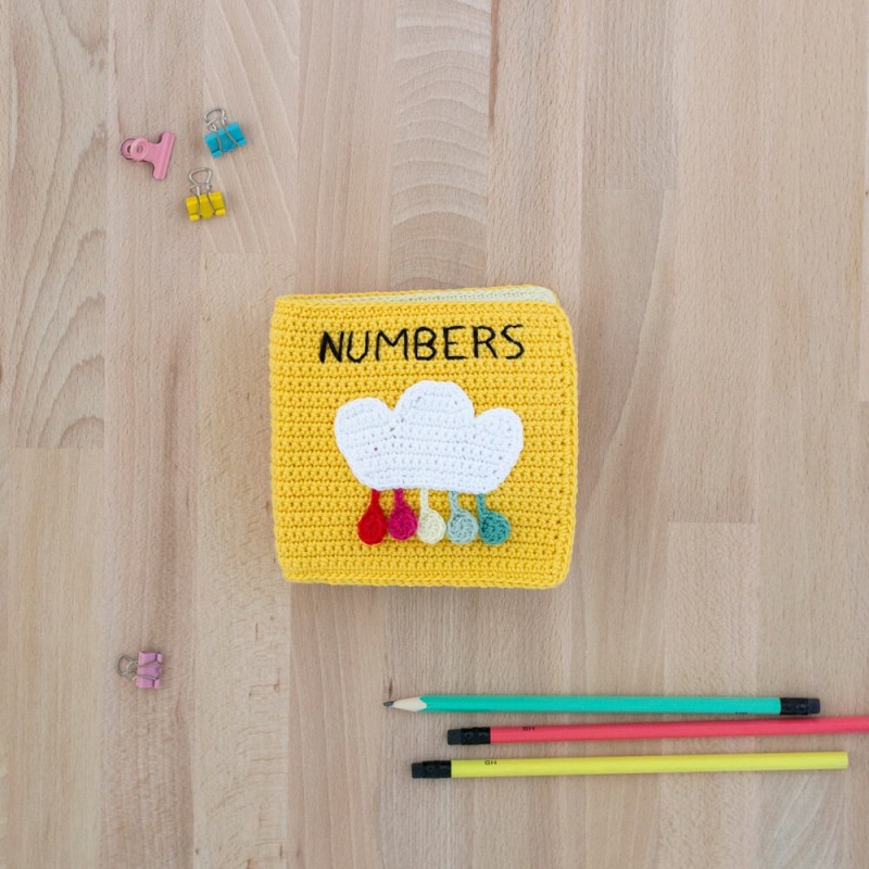 En el interior del libro de números podrás tejer diferentes accesorios en distintas cantidades para acompañarlos del número del que se trata. Por ejemplo, teje una manzana y borda el número 1 en inglés «one», o teje cuatro flores y acompañalas del número 5 en inglés «five». ¡Les ayudará a aprender a contar!