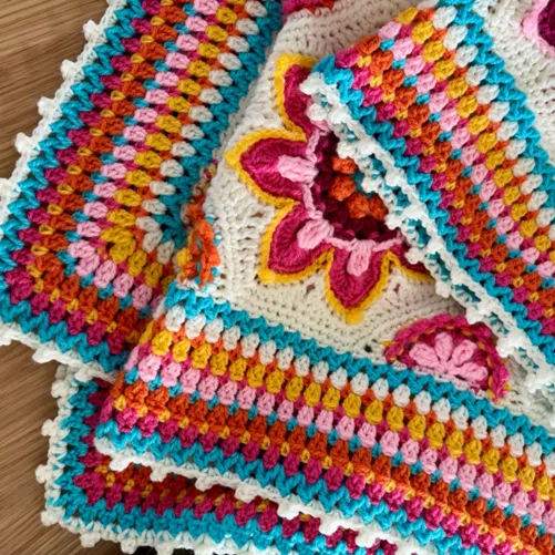 Déjate envolver por la explosión de colores y formas geométricas de esta manta floral. Un proyecto pensado para sentir la calidez y la alegría de un paisaje primaveral.