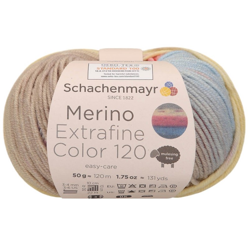 Schachenmayr Merino Extrafine Color 120 es una lana jaspeada diseñada por Arne & Carlos que ofrece preciosas combinaciones de colores que forman tejidos rayados con efectos muy originales.