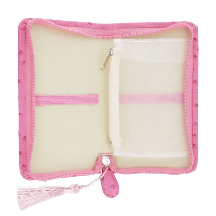 En el interior hay cintas elásticas para los ganchillos y un compartimento interior para tapones, agujas adicionales u otros accesorios de costura. Tiene una preciosa borla decorativa.
